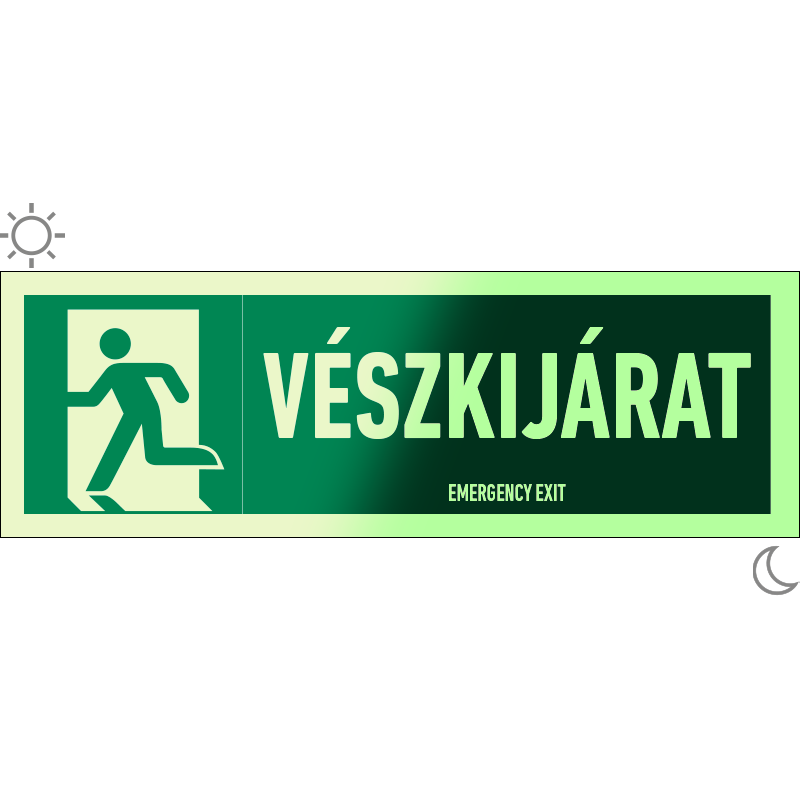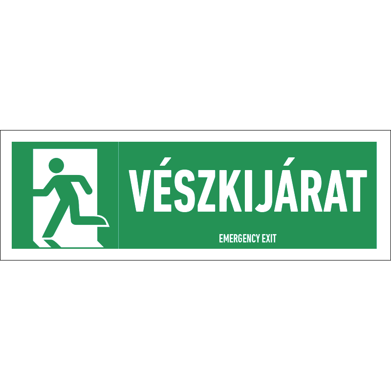 A “Vészkijárat” a vészkijárat helyét jelző zöld alapon fehér piktogram + magyar nyelvű felirat.