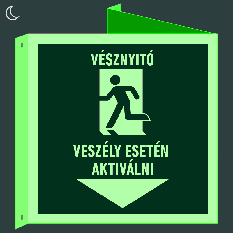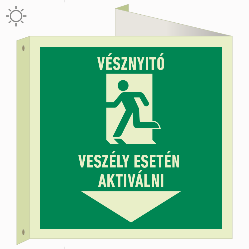 | Vésznyitó. Veszély esetén aktiválni! utánvilágító tábla, faltól elálló, sátor alakú, kétoldalas (piktogram + felirat) 200x200 mm MET109003UTM02000200 | utánvilágító PVC | 330 mm | 200 mm | 130 mm | db | 5850 Ft | 7430 Ft |
