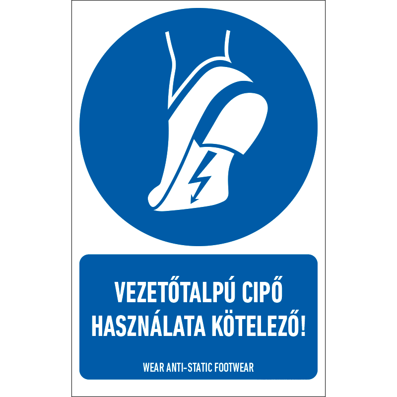 A “Vezetőtalpú cipő használata kötelező!” az egészség védelmére vonatkozik: munkavédelmi lábbeli használatát előíró kék alapon fehér piktogram+felirat.