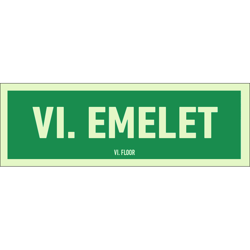 A “VI. emelet” a lépcsőház szintjét sötétben utánvilágítva jelző zöld alapon fehér felirat.