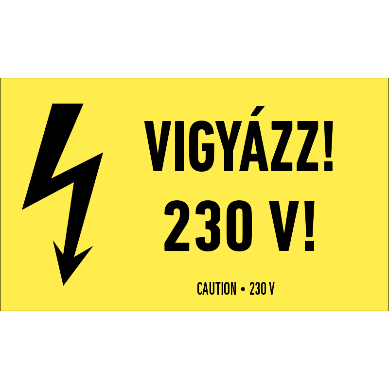 A “Vigyázz! 230 V!” a nagyfeszültségű áram veszélyére figyelmeztet.