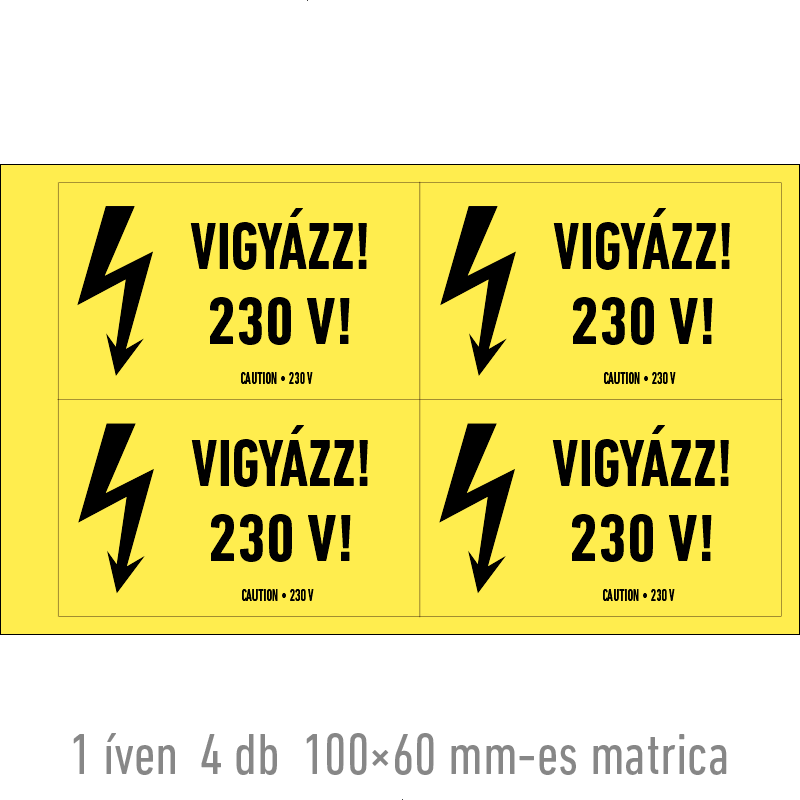 | Vigyázz! 230 V! matrica 250x160 mm ERV062001ONV02500160 | vinil öntapadó | 250 mm | 160 mm | 0.2 mm | db | 725 Ft | 921 Ft |