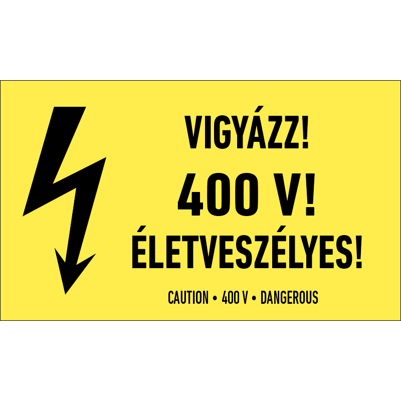 A “Vigyázz! 400 V! Életveszélyes!” a nagyfeszültségű áram veszélyére figyelmeztet.