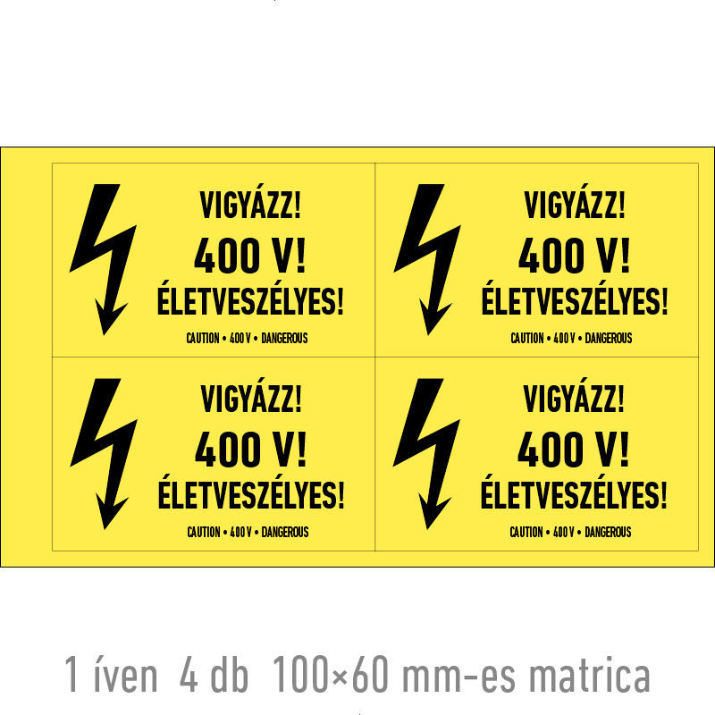 | Vigyázz! 400 V! Életveszélyes! matrica 100x60 mm ERV046001ONV01000060 | vinil öntapadó | 100 mm | 60 mm | 0.2 mm | ív | 275 Ft | 349 Ft |