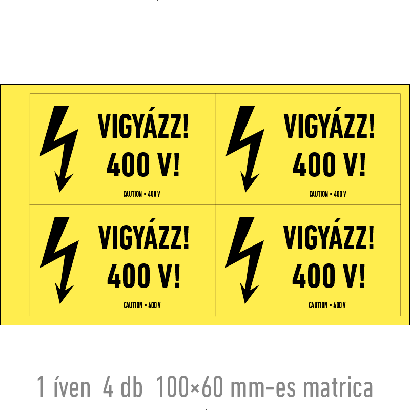 | Vigyázz! 400 V! matrica 250x160 mm ERV063001ONV02500160 | vinil öntapadó | 250 mm | 160 mm | 0.2 mm | db | 725 Ft | 921 Ft |