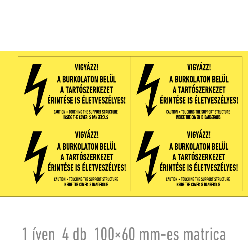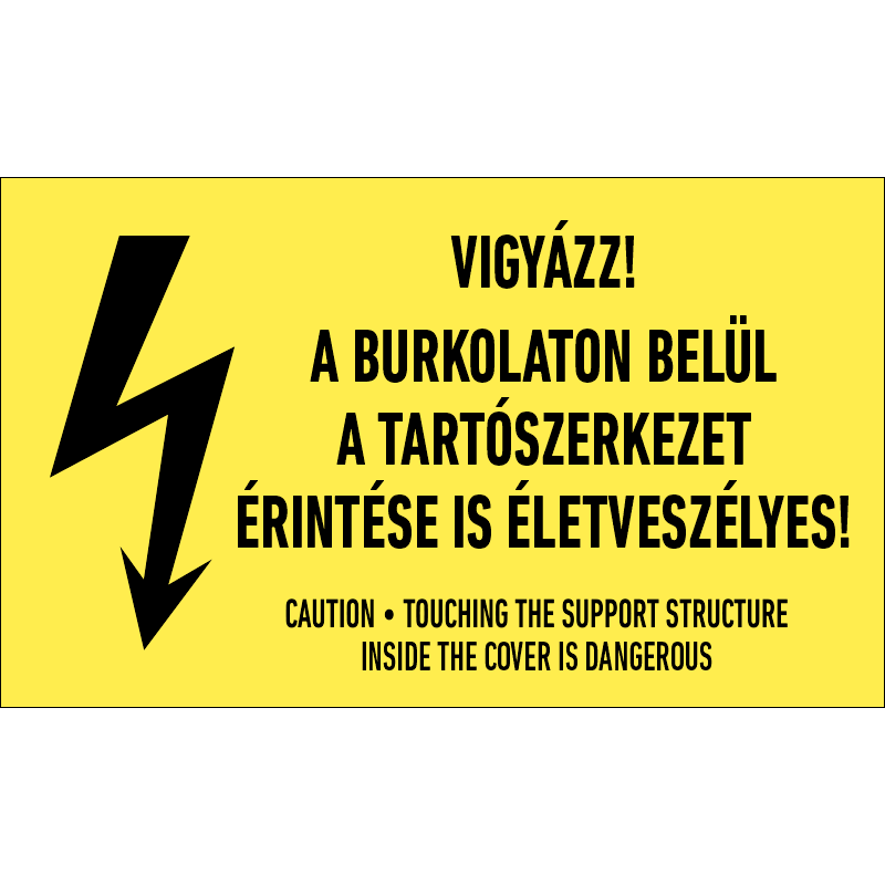 A “Vigyázz! A burkolaton belül a tartószerkezet érintése is életveszélyes!” az elektromos berendezés érintésének veszélyére figyelmeztet.