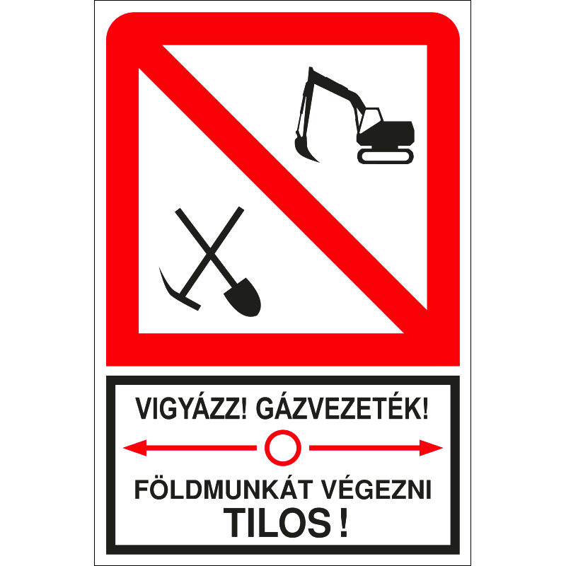 A „Vigyázz! Gázvezeték! Földmunkát végezni tilos!” a földben húzódó gázvezetékre figyelmeztető felirat piktogramokkal.