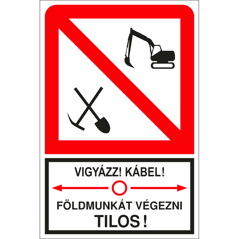 A „Vigyázz! Kábel! Földmunkát végezni tilos!” a földben húzódó kábelre figyelmeztető felirat piktogramokkal.
