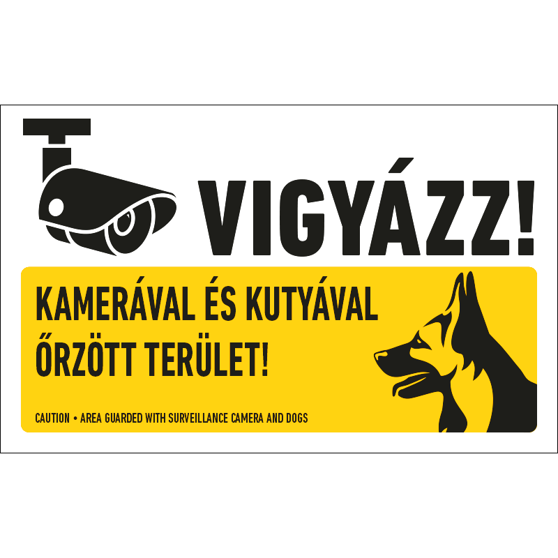 A “Vigyázz! Kamerával és kutyával őrzött terület!” a biztonsági kamerás megfigyelésre és a kutyaharapás veszélyére figyelmeztető grafika+felirat.