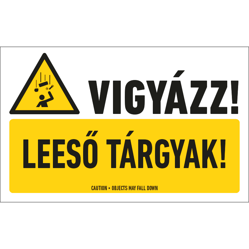 A “Vigyázz! Leeső tárgyak!” a lehulló szerszámok okozta balesetveszélyre figyelmeztető piktogram+felirat.