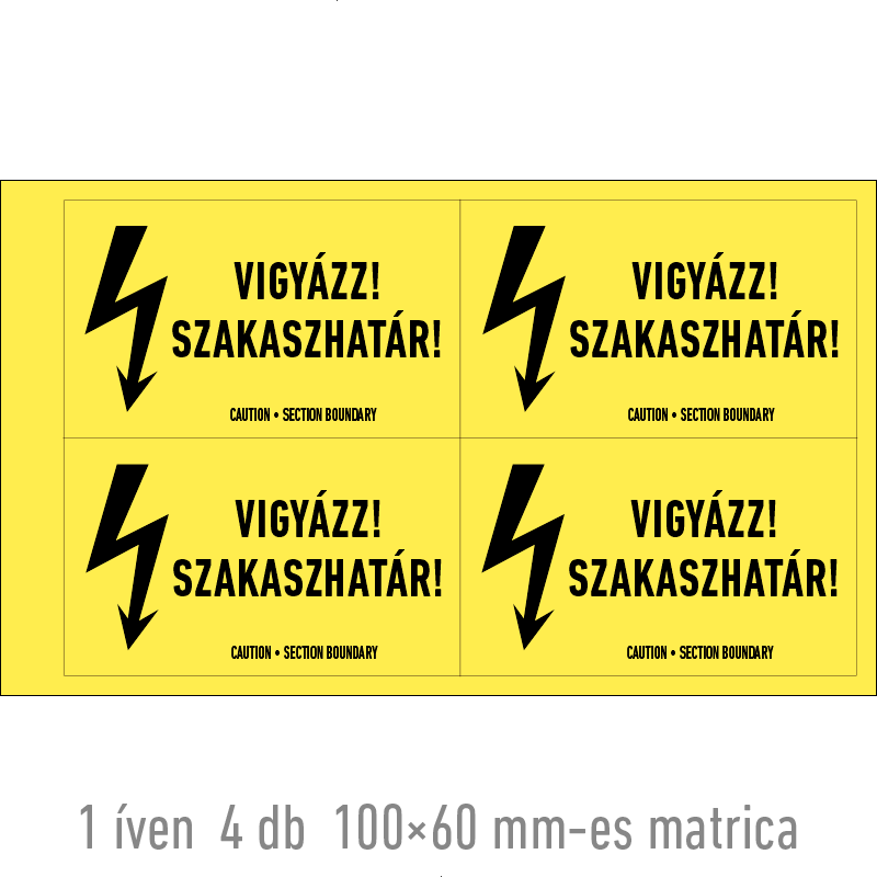 | Vigyázz! Szakaszhatár! matrica 100x60 mm ERV097001ONV01000060 | vinil öntapadó | 100 mm | 60 mm | 0.2 mm | ív | 275 Ft | 349 Ft |