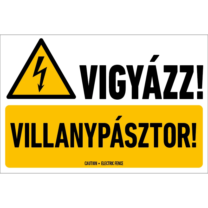 A “Vigyázz! Villanypásztor!” az elektromos elkerítő huzal veszélyére figyelmeztet.