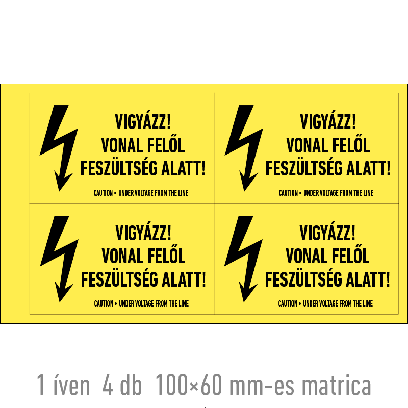 | Vigyázz! Vonal felől feszültség alatt! matrica 100x60 mm ERV021001ONV01000060 | vinil öntapadó | 100 mm | 60 mm | 0.2 mm | ív | 275 Ft | 349 Ft |