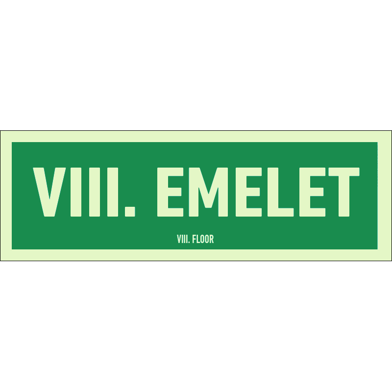 A “VIII. emelet” a lépcsőház szintjét sötétben utánvilágítva jelző zöld alapon fehér felirat.
